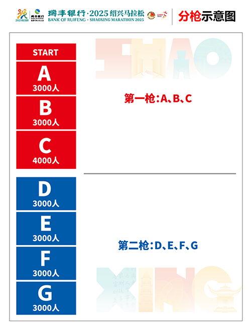 瑞丰银行·2025绍兴马拉松采取严格的分区检录和分枪起跑管理办法,组委会原则上要求所有参赛选手按照号码布上的信息,检录入场参赛。特殊情况下,允许前区选手进入后区检录起跑(如A区可在B-G区起跑);但不允许后区选手至前区起跑,如B区选手至A区起跑,依此类推。如违反则取消该选手的成绩和排名,并追加禁赛一年的处罚,务请所有参赛选手遵守。